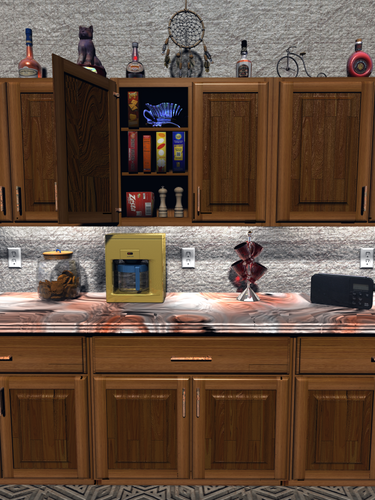 I wan't real happy with the way the chosen material laid on my first image of the kitchen cabinets. So I went back into Sketchup and rebuilt them so they had rails and stiles. Then, when imported into Bryce, I could orientate the wood grain as would be seen on actual rails and stiles. But when I put the cabinets in and sized the back wall for the view I wanted, I saw the entire scene was going to look rather sterile without something on top of the cabinets. So thanks to Archive 3D, I found several things which after a bit of work, I added to the kitchen cabinet scene. The image below is the result of adding more than just my uv mapped boxes.