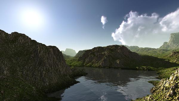 Here's another of Horo's terrains, again my material relies heavily on curvature filtering. Also I spent quite some time faffing with the water effect.