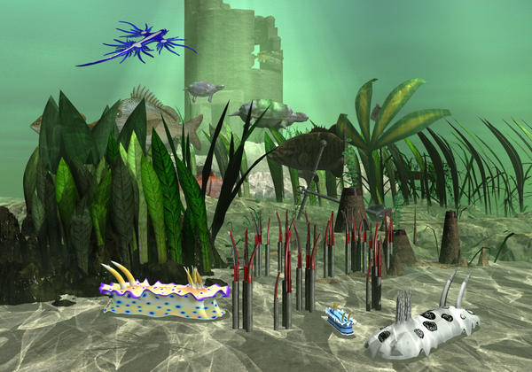 In the meantime, here's yet another underwater render but this time with 4 nudibranchs I made in Wings (mostly before the shoulder injury).