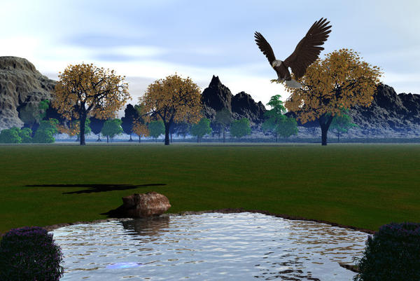@Sandy: The eagle, and its shadow, is a real nice touch. The tree line looks a bit to uniform, at least to me. Perhaps scattering the trees more might help?