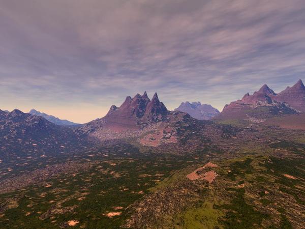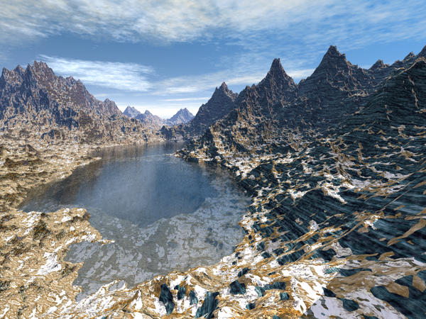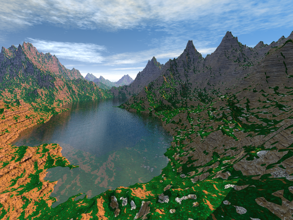 In my previous post, where I posted an image of stacked terrains, Horo suggested using a plain gray material. I gave that suggestion a try but was not satisfied with the results. So, I started using other materials and came up with the first two. Only difference between these two and the original is that I moved the sun down slightly to remove some of the real strong shadows. In the last three I changed the sky. I also added a water slab in the first two of the last three. The last image is just another location on the stacked terrain. None of these took over 20 minutes to render.
