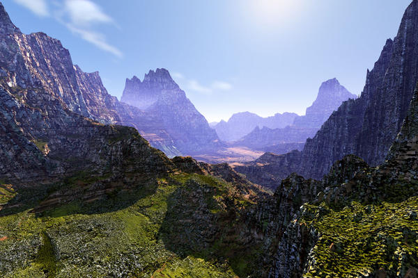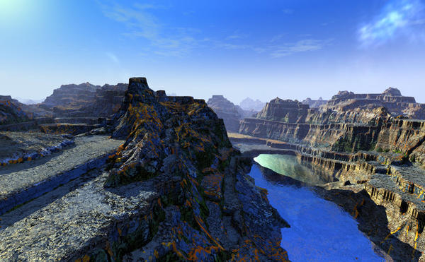 @mermaid: Your concerns are the same I run into, size and camera position. Your recent scene looks nice, though have you thought of lightning the terrain material to help bring out the overall shape of the terrain? When I create a stacked terrain, I'll play with several material settings until I'm satisfied with not only the material but how it helps define the terrains.