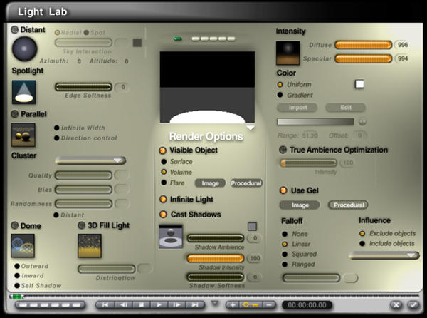 @cjreynolds - your settings for Diffuse and Specular may be a bit high. Exit the light lab and enter the Mat lab for this light and you can tweak the visible light quite nicely. The Image and Procedural buttons only work for Flare, which seems to be a bug to me.