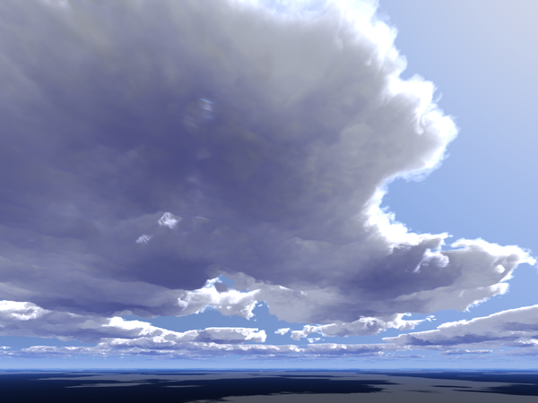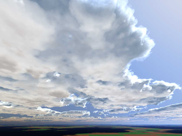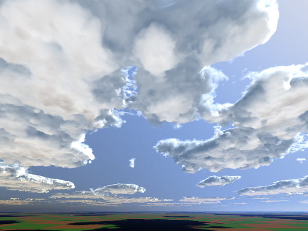 I'm another of those who set aside a work to experiment on something else. In my case, volumetric clouds. I was experimenting with spheres, and found that more than just a few, less than 10, and the clouds don't look right. They almost resemble cauliflower heads. So I gave David's Volumetric Clouds part 1 another go, several really, and while it's not ingrained in my fingers yet, I came up with the following images. I've seen some banding in some of the images, which I'm not sure how to fix, but that's what experimenting is for. Two of the following images have a material I applied to the ground plane, I got tired of seeing a plain ground. It's just the blue and white check recolored and resized.