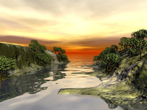 and the finished image. The terrain I put the trees on is the grassy one, it is a duplicate of the beach one just edited around the edge to allow the beach to show and raised by a very tiny tad on the Y axis.