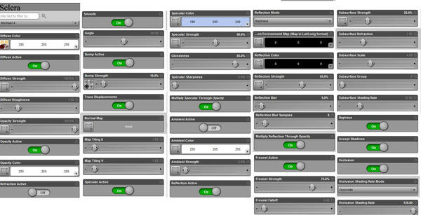 I'm not sure how I can show full settings. I cobbled together a screenshot from the ones from the sclera that seem to be the trouble area.