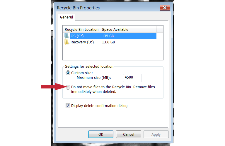Recycle Bin _ Make sure this is NOT selected ( see image)
