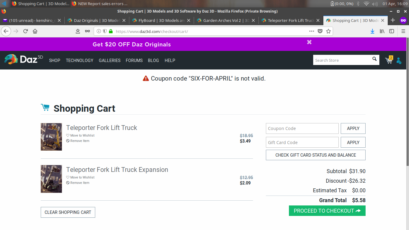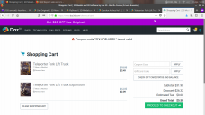 The $6 coupon can then be used for Daz Originals but NOT for PC+ items. The Fork Lifts you are trying to purchase are PC+ items.