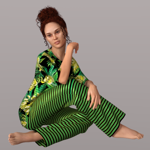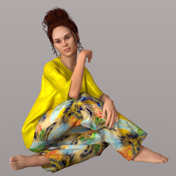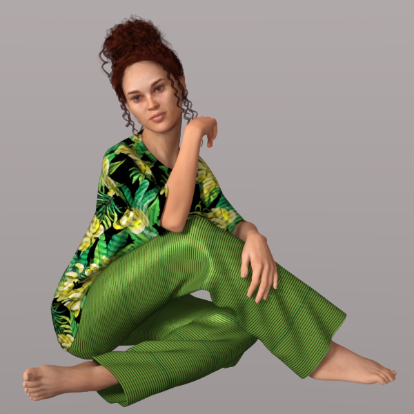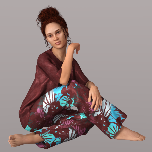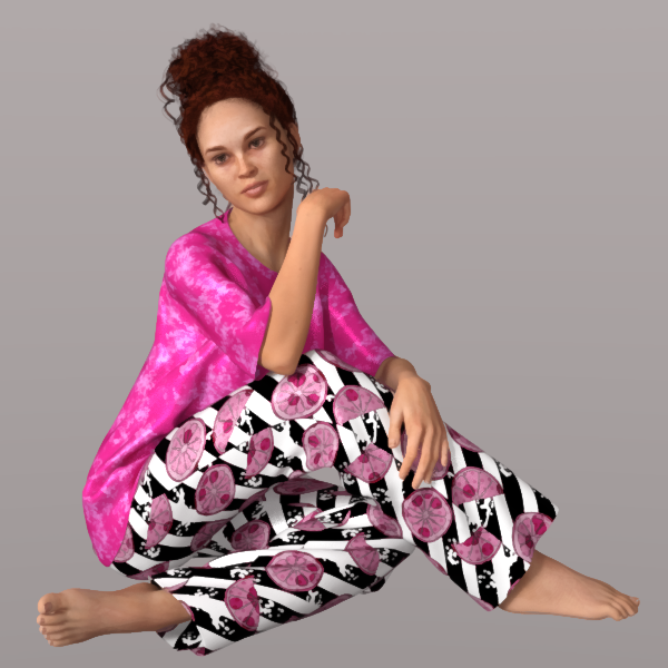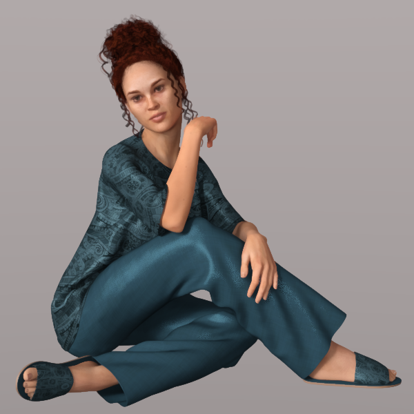 When selecting the pants for a shader preset, that is the "Housewear Outfit" in Scene. It's a bit strange the top is labeled separately but the pants aren't.  I have to be honest, I really like this set for a loose, lounge around outfit, but the set is very limited in colors. A white was included, which is GREAT for creating your own color in the Surface pane, but there are NO patterns or prints, so that's a big yawn. Which got me looking at shaders.