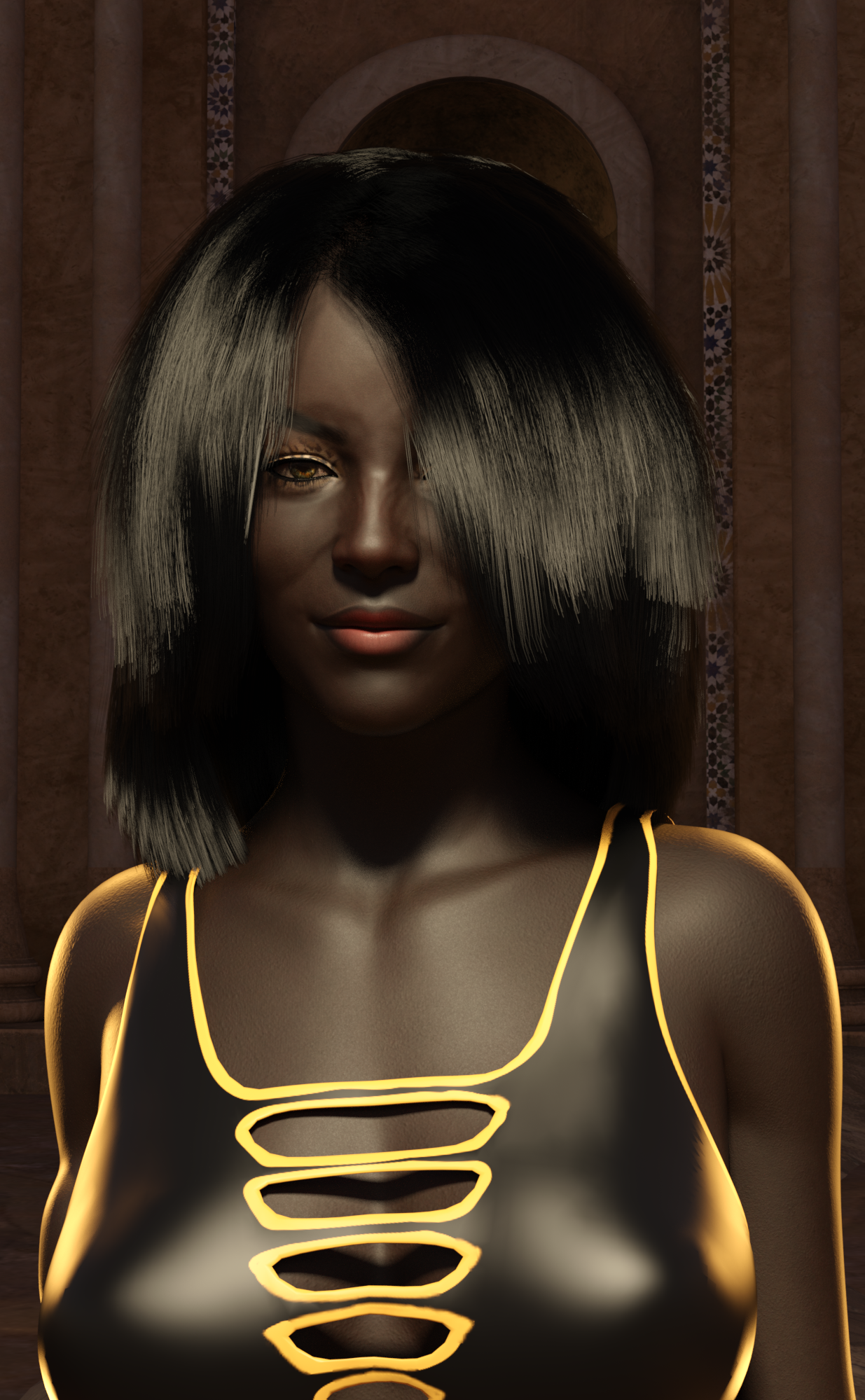 I love having a broad range of racial and ethnic diversity of characters. The one shade of skin I have had the most problem lighting has been the deeply rich dark tones of brown and near blue-black. I bought her to see what I could do with her. And as I said, it was the gold makeup that triggered that particular set of render choices I made. I do not generally enjoy doing fashion/fantasy renders.