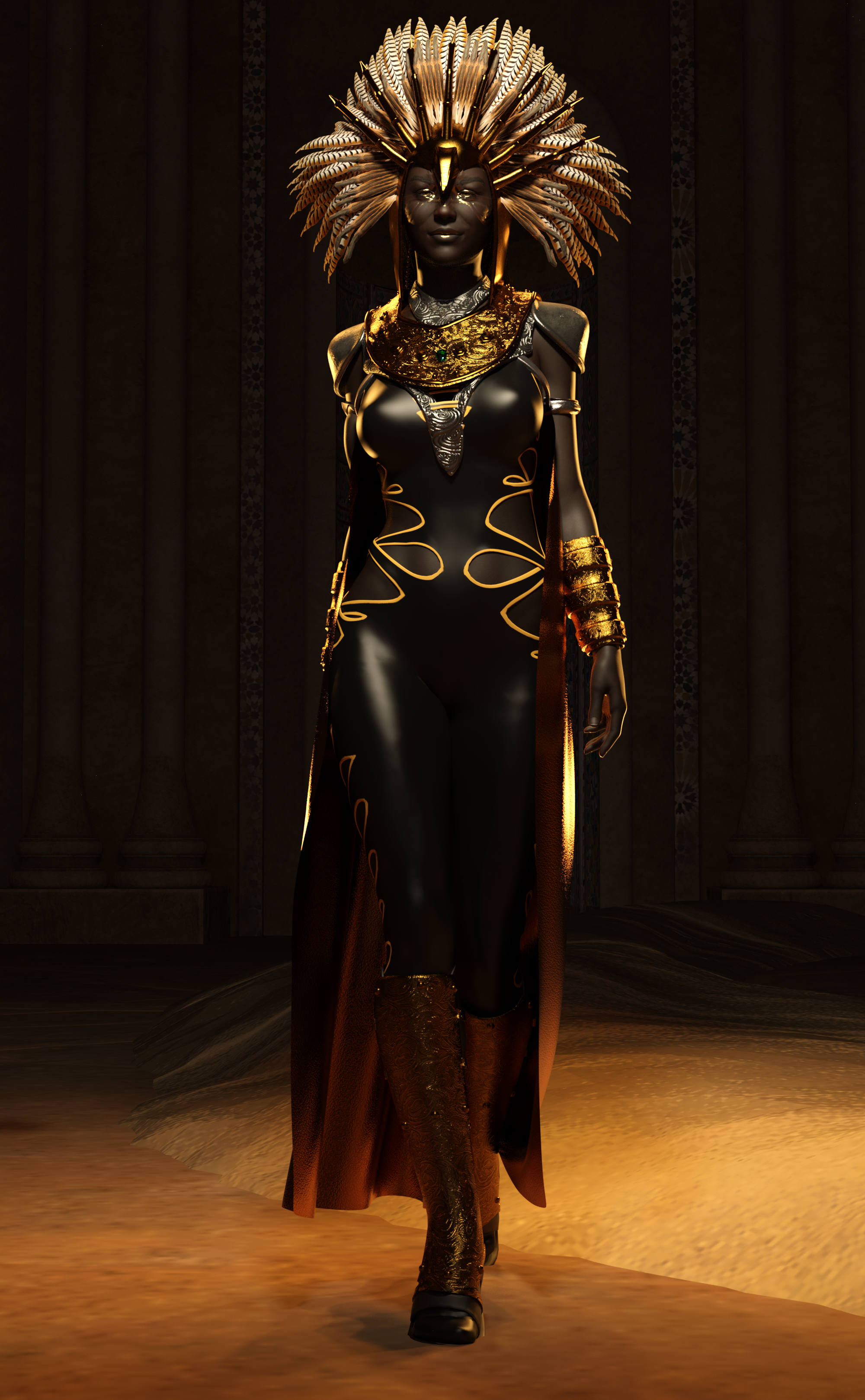 VYK Zuri HD - She has deeply dark skin, fibermesh brows, along with painted ones, lovely eye choices, lip colors and makeups. It was the gold makeups that gave me the idea for render and an hour into it, a Marvel movie came on, and Wakanda and the Black Panther were in it. It does drive me a little crazy to not be able to see the makeup without Iray preview or taking camera snips.