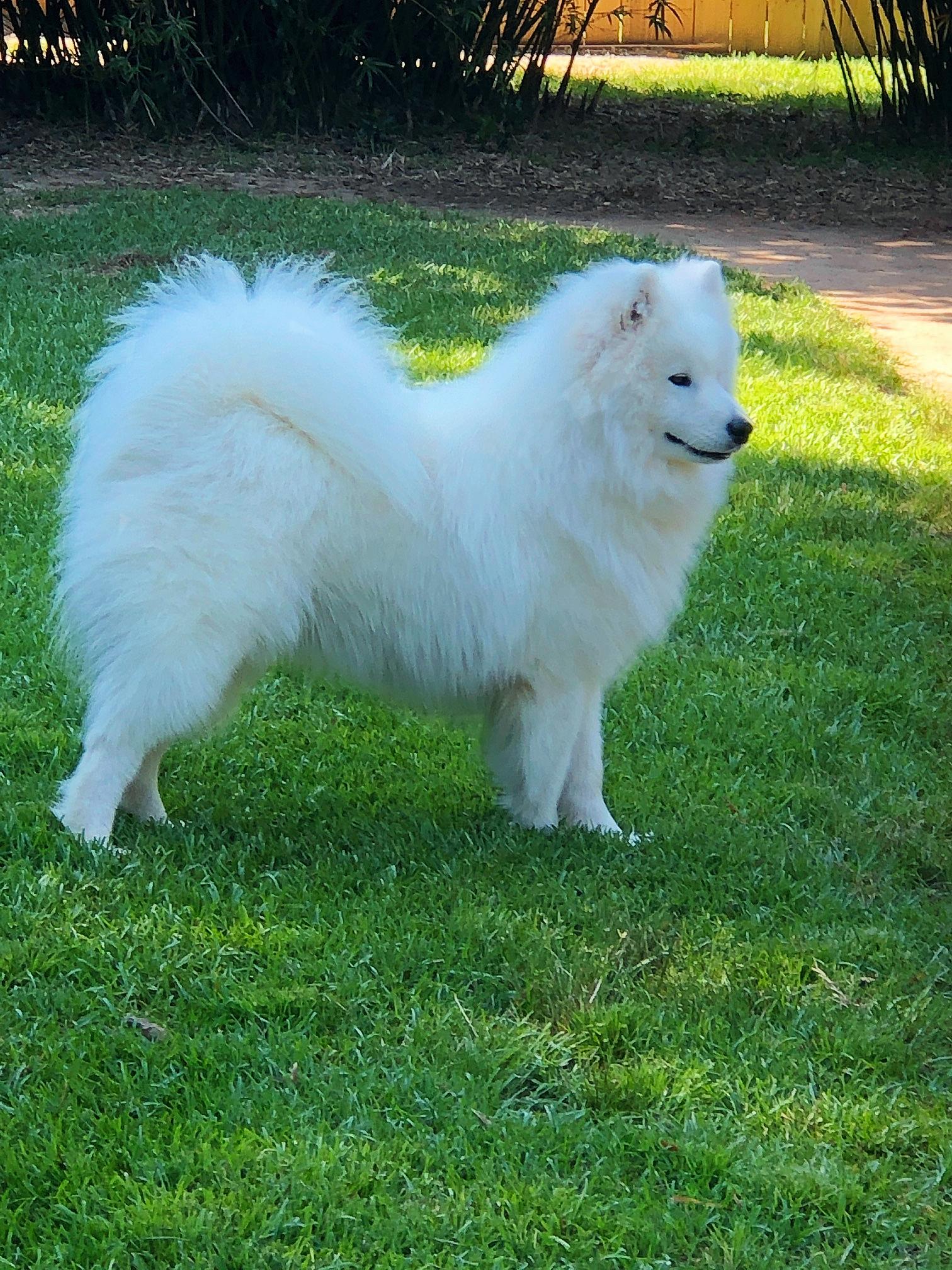 And he's only had two baths in four months :)  I don't let him stay outside very long or get too hot. (Well, he does, this is Florida.) He shoots out the back door, races around for about five minutes, putzes for another 2-3, then it's inside to air conditioning, a window air conditioner for the nook / dogs, and a spare high velocity fan (Stetson's) for a floor fan. He gets brushed three to four times a week and I absolutely LOVE doing that. It's like cuddling with a huge teddy bear!