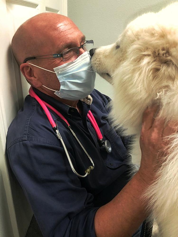 One of the vets with Ci Pwff and a second shot.   He is shown on their site as the pet of the day.  I posted a second photo there of the main vet (Pwff's) on the floor with him. He just plopped right down and began cuddling with him. Love that guy.