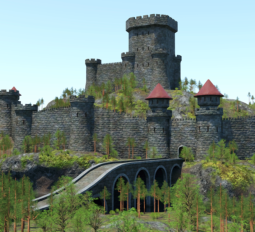 So unless you get rid of ALL the trees, you can't get rid of the ones inside the walls. They are grouped by Pines and Ash, btw. So this to me is a blurred DOF background product. (I also don't like the barren ground, no ground cover. Just plain gray. How are those trees growing in such desconsolate conditions? They aren't desert trees! )