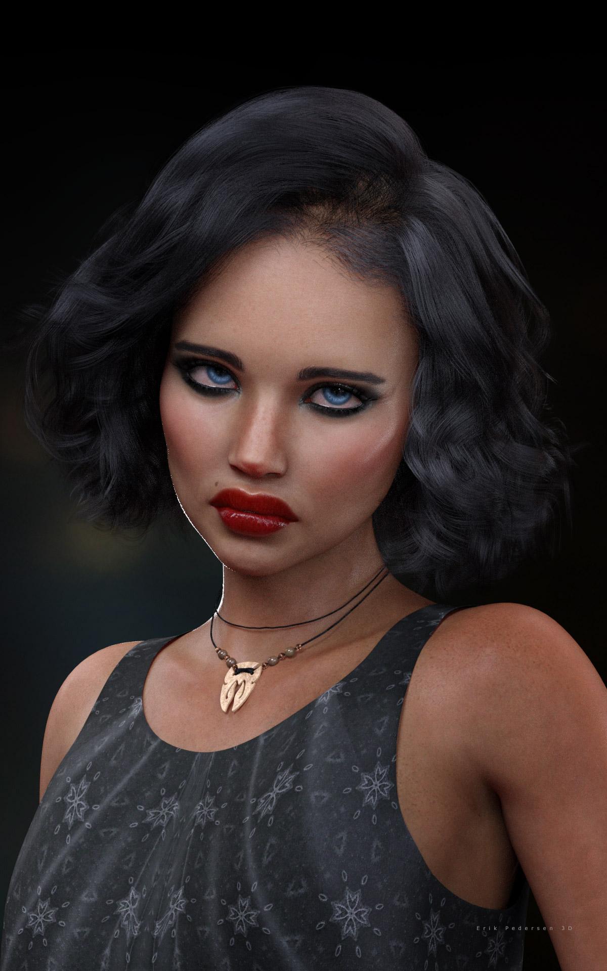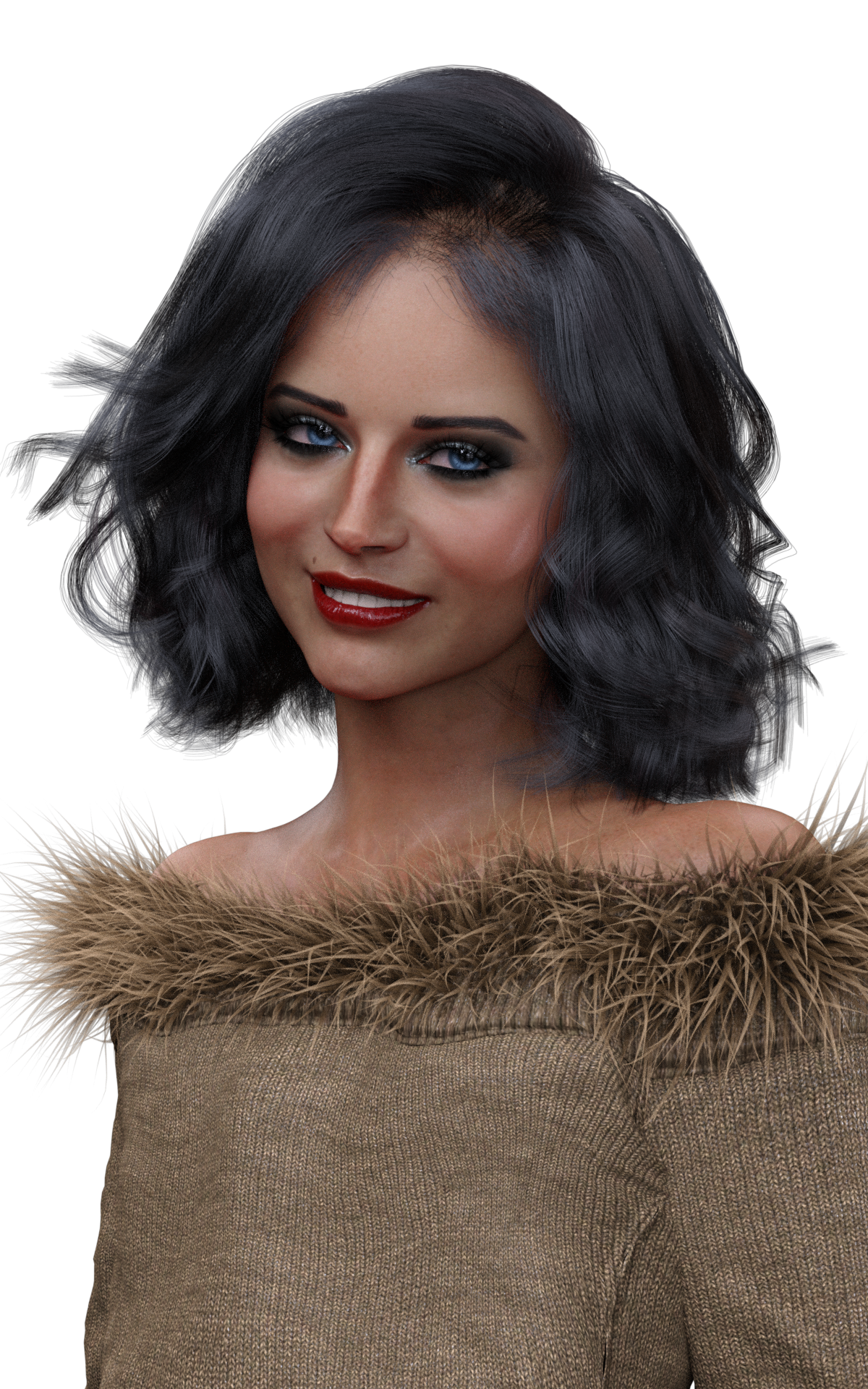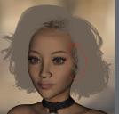 Here is a render of Neroli Hair on a G8F character, which is part Alawa 8 and part Rynne 8. I haven't modified the hair cap at all, so those dark horizontal lines (hairs) on the forehead are still there. I used both Left and Right wind morphs before simulation, to try to get the hair to not intersect her face. I see it is still poking into her cheek a little on her left. I might be able to fix it with Mesh Grabber. Oops, no, I forgot that Mesh Grabber doesn't work on dForce hair. sad