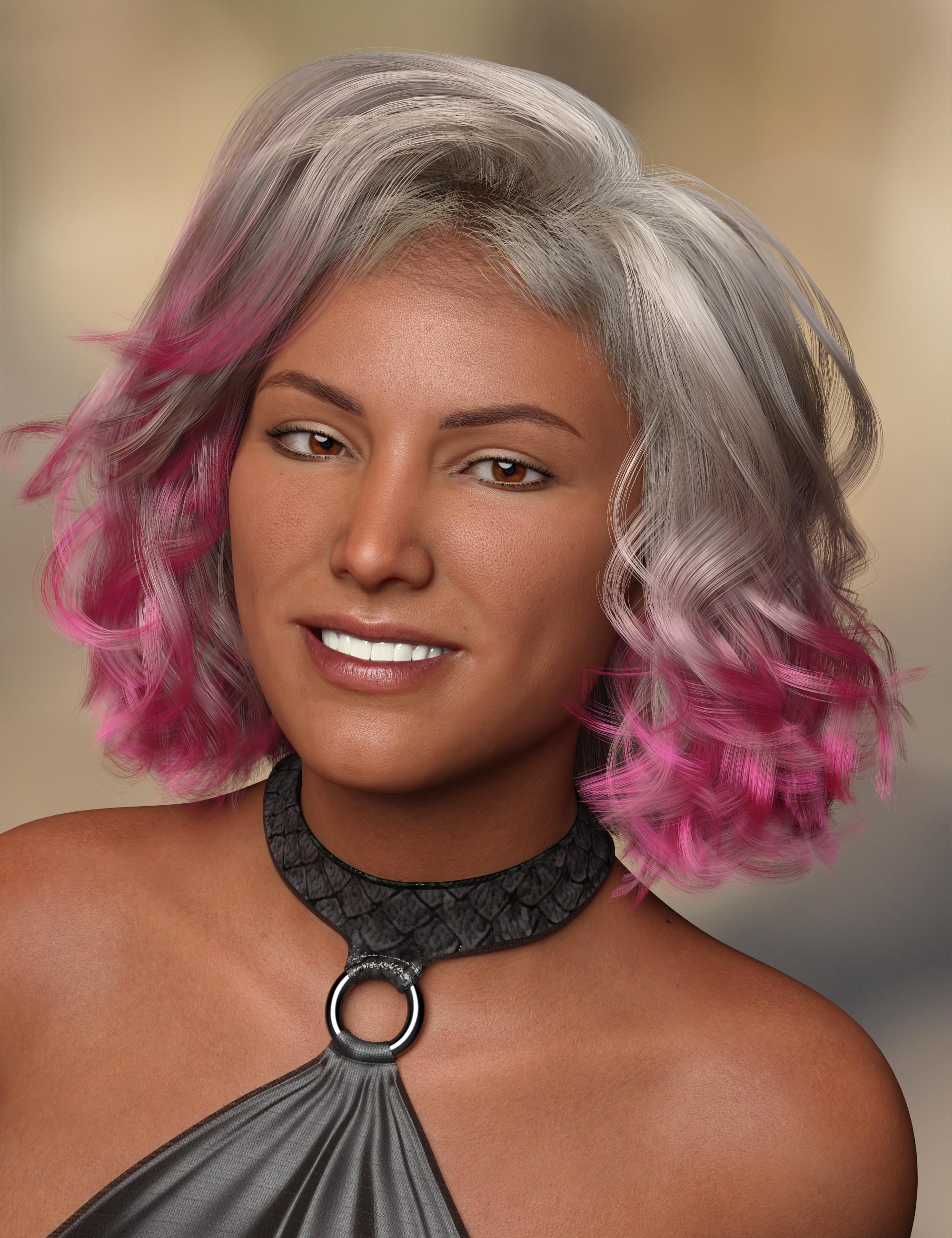 I tried a plain base G8F shape with Alawa skin. I used the Blonde hair with Pink tips. On this one I can more clearly see the pink just on the ends rather than also on the roots. I was able to simulate it without morphing the hair away from her default face shape.The hair is very sparse in the top center, letting a lot of the cap show in that area. I was surprised at how dark the cap was for a blonde hair. Again, I did not modify the settings of the cap opacity here.
