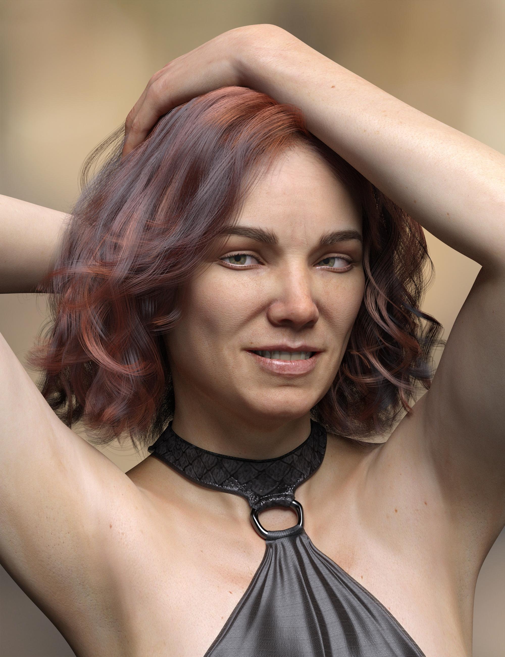 I was very impressed with how well it simulated in this challenging pose. The only problem I had was the black spot on her forehead, caused by the cap intersecting the character mesh. This is a common problem with hair, easily overcome by moving the cap forehead area out away from the character head. Unfortunately, the cap of this hair doesn't have any morphs to do that - not even a simple Expand All. Mesh Grabber will be able to correct this, because the cap is mesh and not dForce hair. I reduced the cap opacity to 0.2 in this render. Her arm on her head hides the thin spot, so I got by with it here.