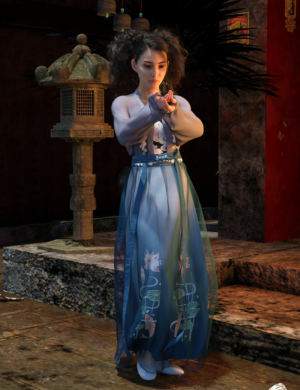 I started work on another character I purchased in October, Rory HD for G8F and used the dForce Song Dynesty Female Suit on her (the outfit took nine minutes to load). She has some interesting features and subtle makeups (Thank you Lyoness!). I have her in Surrounding Curls and used China Houses (it appears as Chinese House Full Scene in the Scene pane & had to close the eye on some modern political pictures on a wall) and a Ghost Light, and AM's Mouse. One of these days I will remember to write down the pose pack and pose I used, searching for it in this wonky Daz Sudio sort funcion right now was a nightmare, but it was Elysian Poses. The outfit simulated very nicely, but I didn't stress test it with a sitting or kneeling pose either. I forgot to add I used the 101 Expression Library for her eyes and mouth. They are very subtle and I didn't use them fully.