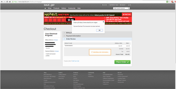 I was just going to say it's possible your credit may have expired, and you need to change the expiration date in your saved profile in your account here in the DAZ store.
