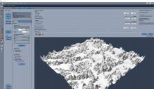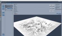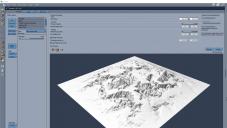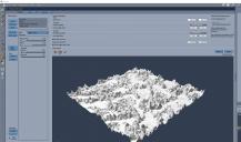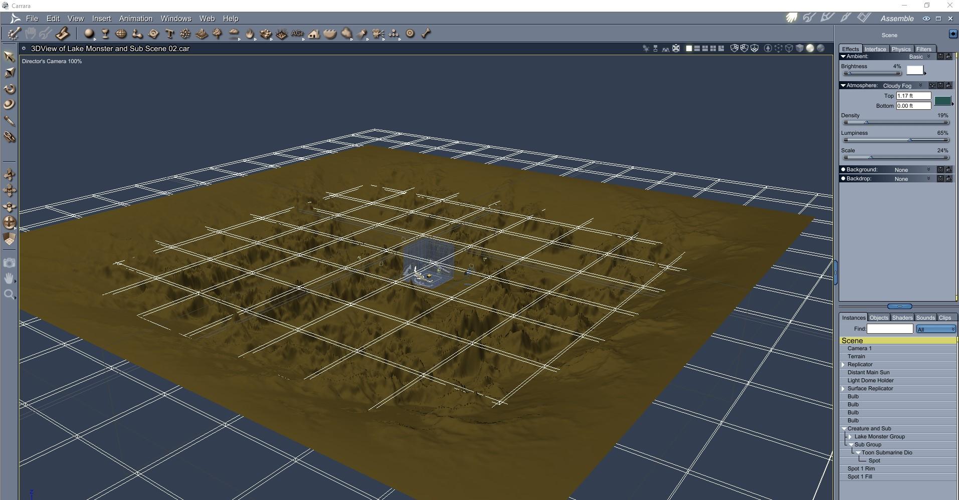 I inserted a terrain object.  I wanted some good stretches of smooth bottom interrupted with underwater canyons and mountains.  But it needs to be below the shoreline.  That U shaped terrain was created with a combinaiton of two filters: zero edge, and invert.  The flat portions of the lake bottom were created with the plateau filter.  I tried to get a murky bottom by using the scene tab.  Under atmosphere there is a menu option for "cloudy fog."  Don't know that I had ever used it before.  I played with the fog color and settings to try to get a murky bottom.  Still appears too patterned to my eye, so I may experiment some more.   I got the lake surface with the ocean primitive in the regular replicator (not surface) set to grid and covering the hole.