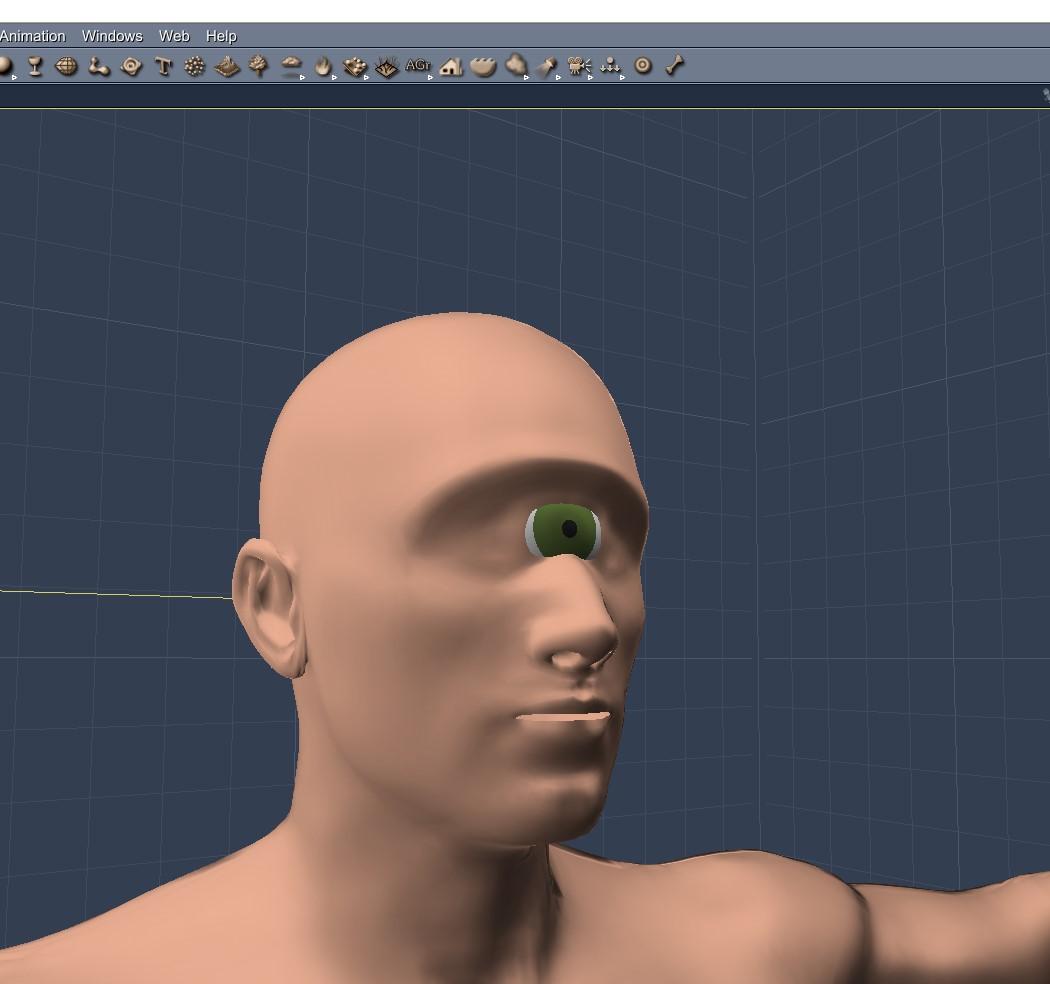 Eyeballs and lids were all modeled circular and spherical. I then created a morph for the eyesockets and stretched them on the z axis and tilted them slightly inward at each other (for more goofiness). The eyeballs and lids are separate objects, grouped, and stretched along the z axis to match the empty morphed sockets. By creating a Group for the eyeball and lids, one can stretch the object and when rotates it behaves as if it is spherical and won't tumble' from end to end.