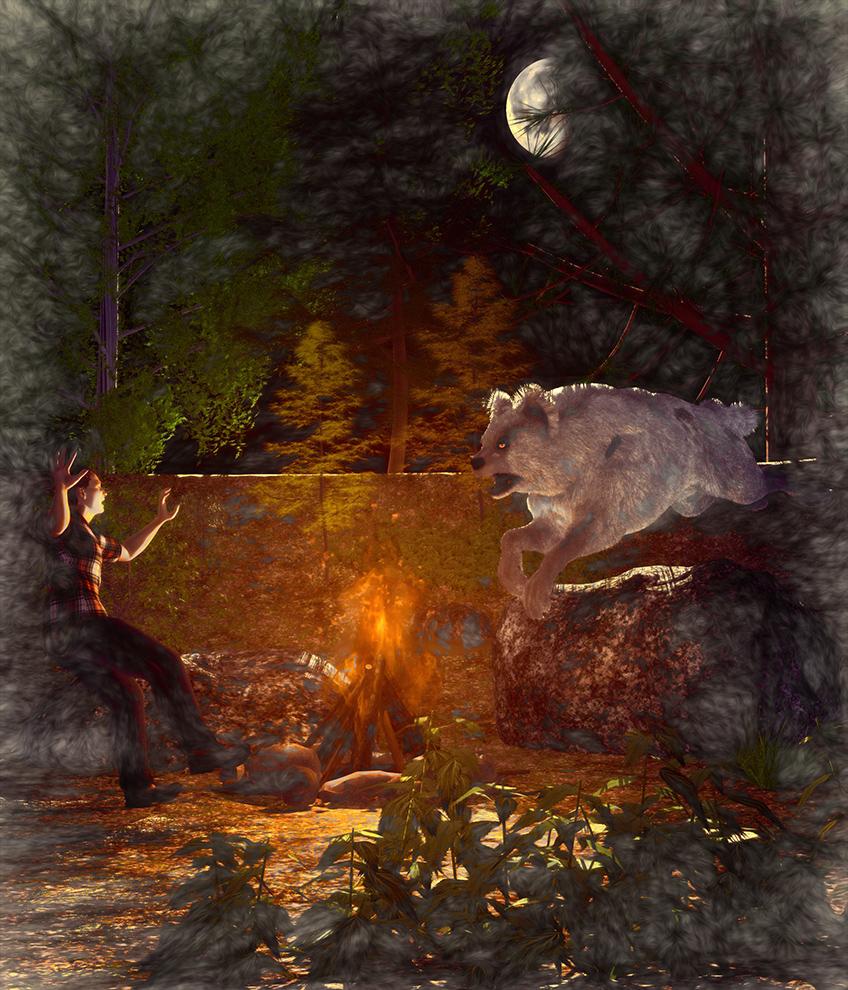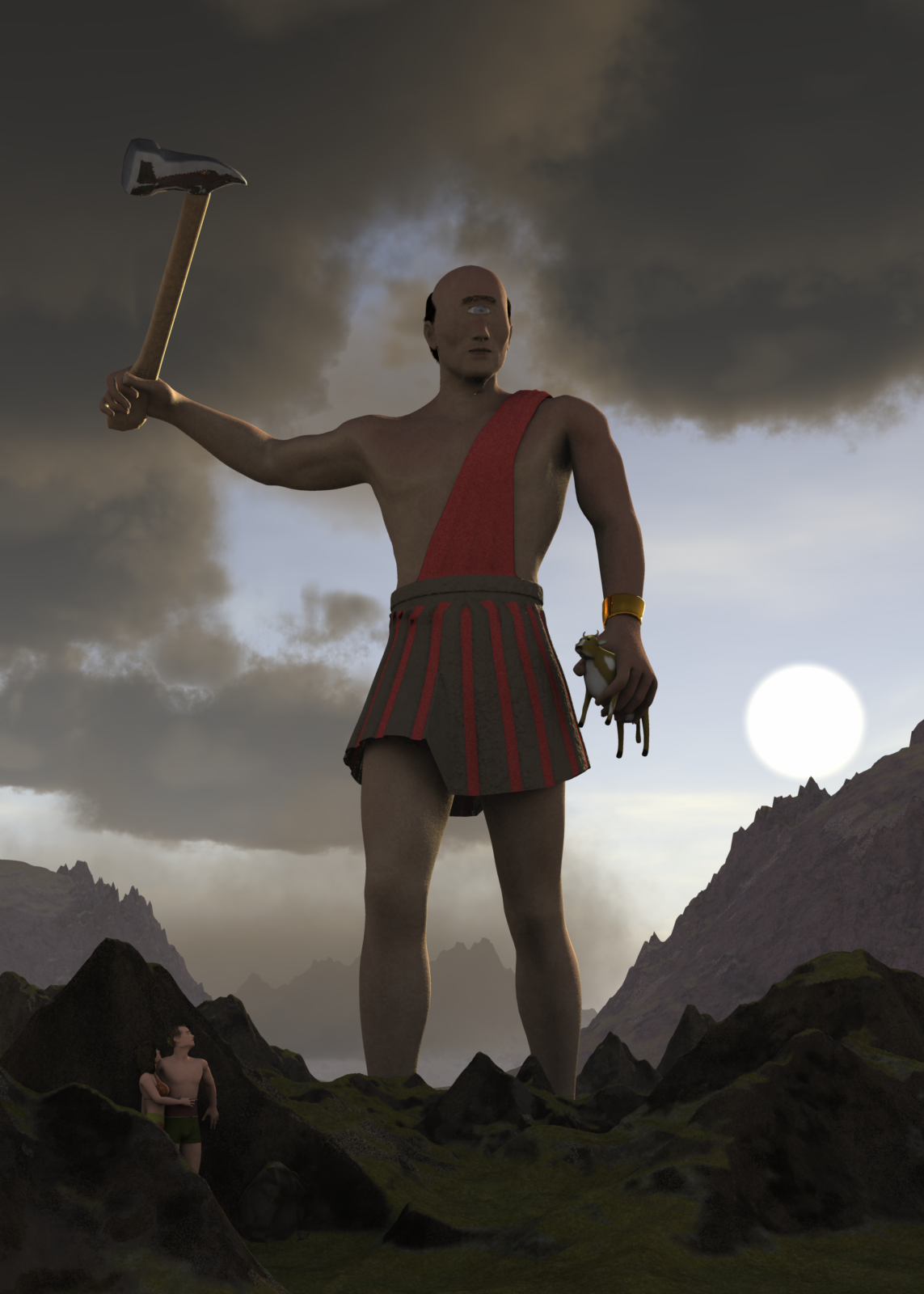 The cyclops also looks much better with the addition of GMIC. I wish the lighting emphasized the eye and the cow a bit more.  Great (classic) poses in the foreground characters.  Is the cyclops searching for these folks?  If so, his head would likely be tilted more downward, and the eye might be easier to enhance.  But the render works just as well if he is unaware of the hidden couple.