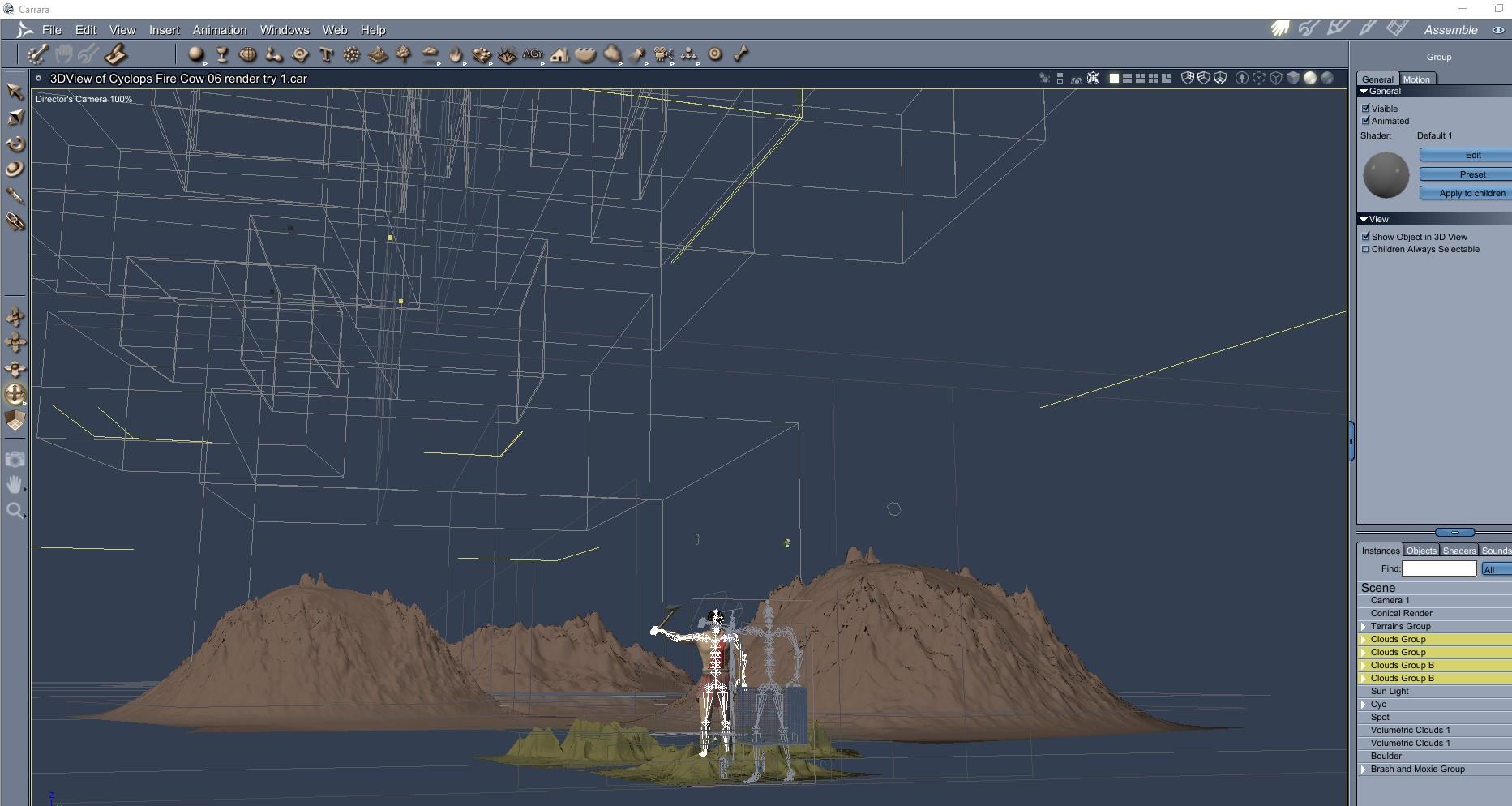 But no cheery mood from me.  Here is my first straight render with a scene with the cyclops. Had lots of little problems.  For some reason, I got an error when I tried to use VWD.  Ended up just attaching clothes to skeletons.