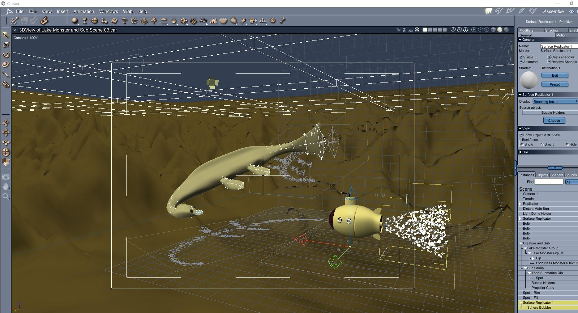 - Bubbles from propeller created with primitive sphere replicated on cones parented to the propeller