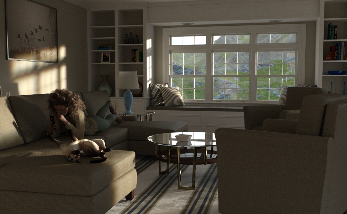 This living room is a great representation of a middle income home. Or what was one before prices went through the roof in the 1980s. But, it is a room within most folks price range. I have been able to place three characters in it, and have them in a reasonable conversation, without them having to look like they have to yell to be heard. There is also space left to add more props if you want. I deliberately left it as it comes. I did not depress any couch, or add additional light beyond the outside HDRI. This is a set that gives great value for money.
