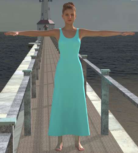 So, as a test, here's what I did... First, in D|S, I exported G2F as an OBJ, but set at Poser scale selection. I then imported the OBJ into Poser Pro 2014. I found a dress I had made for V4 in Hexagon, and loaded into Poser. It was a somewhat close fit, but I did shrink the dress a bit, then scaled down G2F, and ran a 5-frame simulation, bringing her back to 100%, and the dress fit much nicer, but didn't do a full-scale drape. I then exported the re-fitted dress, reloaded G2F, and imported the fitted dress. I then ran a cloth sim, and the dress did drape, but it doesn't look too impressive in the zero pose. I did a quick render of the result in Poser Pro 2014, as seen below.