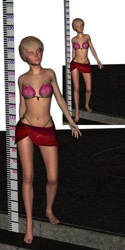Notice the artifacts on the skin (V6 Belle with SSS at 75%) in the small image? It gets less (visible) in larger dimension or close up renders; got no clue what exactly causes this. I've tried adjusting just about anything I can think of from samples and filter settings in the render-settings, adjusting the shader(textures) settings, editing the settings on the lights itself, but I cannot get rid of it. It happens with a simple diffuse light or a complex UE2 light setup or with the Advanced spot/ambient etc lights, and even without any lights added, as is the case with the posted image. It does not happen with all SSS skins, and on some the effect is even worse (and the effect is not visible with SSS turned off).