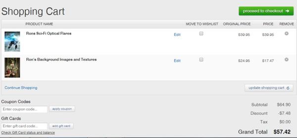 The popup banner says if the new release (Background Textures) from Ron are put in the cart, then there is a discount, and it ain't happening. I tried it with the Optical Flares, and it's a no go. (Yes, I opened the cart and looked.) There was no discount whatsoever. Both items were in the cart simultaneously. There's no "new" product restriction, but the flares aren't a new product anyway.