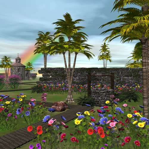 The other thing I noticed is the colorful rainbow. I like that, but it stops short when it hits the area of the palm tree, rather than spreading across the entire sky. I know there’s a Bryce sky with a rainbow, and I’m not sure if that was used or not, but I would’ve liked seeing the full rainbow in the scene.