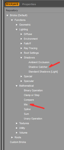 The Shadow catcher is under Lighting/Shadows and the mix brick is under maths.