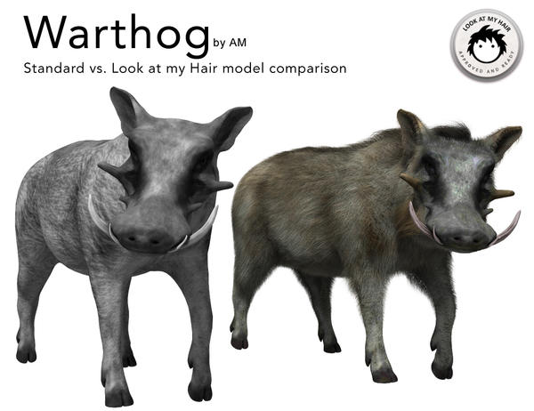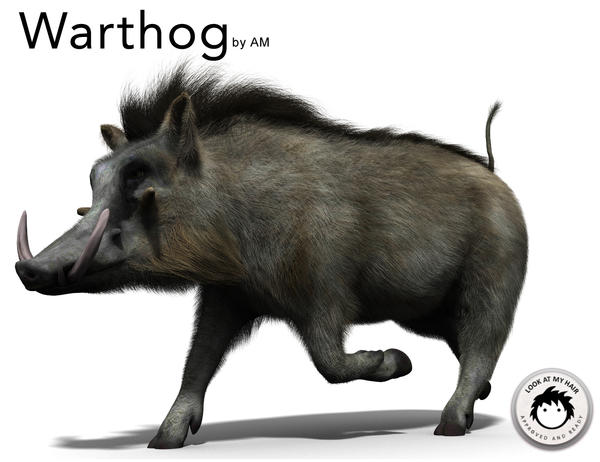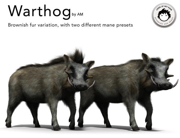"The mighty and powerful Warthog, 11 poses, several morphs, finely rigged and weight mapped for both Poser and DAZ Studio, and Look at my Hair fur presets to provide the most realistic renders.