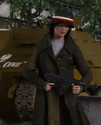 This scene is a depiction of a Polish Insurgent by the captured Hetzer, renamed to Chwat at Napoleon Square during the Warsaw Uprising in 1944.