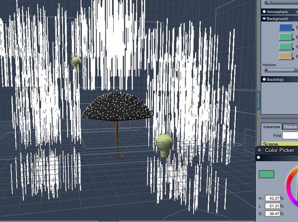 For another entry, I am focusing on a rain concept. I don't think I've done a rainy set up before. For some tests, I created a simple vertex umbrella with a uvmapped shader domain for the top so that I could replicate raindrops on the surface. These first raindrops are small beads. I also created some vertex platforms to host a second set of raindrops. These second raindrops are stretched to make streaks and the platforms are made invisible. Both sets of raindrops have water shaders.