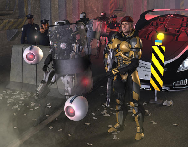 Okay, haven't done a Sarge image in a while. This one was fun. Some highlights: I really liked the headpiece in Code 246, which autofits nicely to gen 2 male. That outfit is showing 50% off right now, so if you like it, now is the time to buy. The location is Digivault's Hard Target which I haven't yet had a chance to use yet, but looks great so far.. One thing I like about Digivault's stuff, is you get detail, without it taking a super long time to render. The robots are cybermech4.1 which are quite highly detailed and look nice by dzfire. And the Little flying bots are an Easter egg in Interceptor set which I had no idea existed until I was looking at the promo art the other day. The little robots are inside bike's hatch. They are unfortunately attached to the bike, but you can remove them, by using the pixel editor.