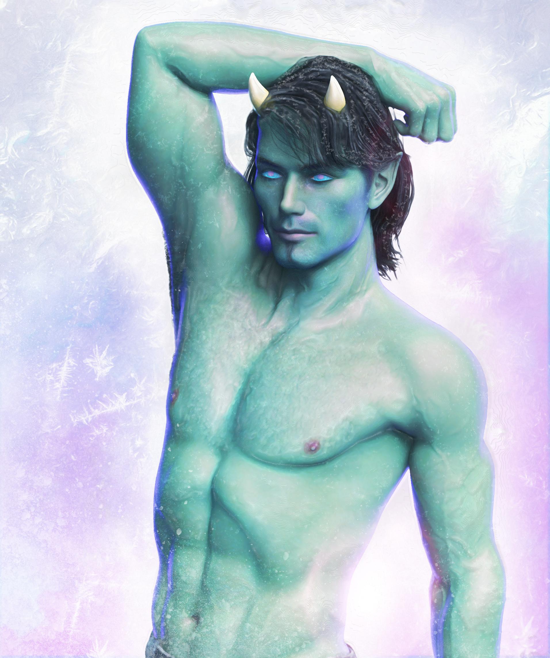 Here's the ice tiefling version. Tried a new photoshop technique to make the skin look frosted over and covered with solid ice. I didn't like the hair. Very stringy in the front looks greasy to me, and bad choice with the horns, since the part comes right wear the horn root is. But I decided to go with it since it cooked all day while I was at work.