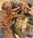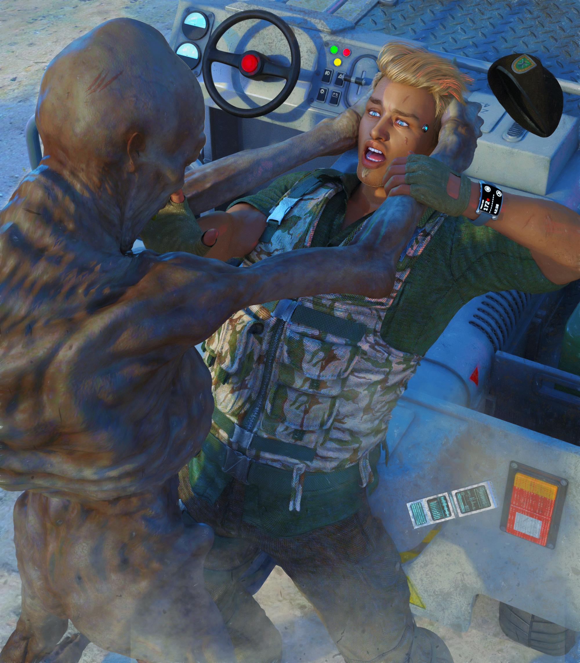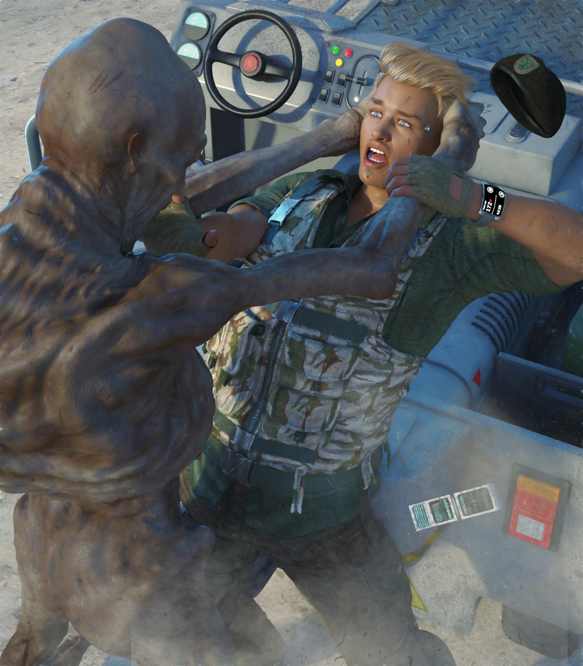 I wanted to do a pose where the villain had his hands around the good guy's neck and had him bent over something like a railing while the good guy fought back by smashing his palm in the guy's  face. So I made a pose for two M7's. When I finished, for some reason I decided to switch the villain with Boogeyman. The unforseen consequence of this, was that Boogeyman's arms were longer than a human and so the good guy would find it impossible to push him away in the face. Further, the hands around the throat became hands around the head, because well, he is Boogeyman and didn't want to behave.  wink I sort of liked the result of this happy accident, although I suspect Boyd doesn't. Owen is more of heavy hitter.