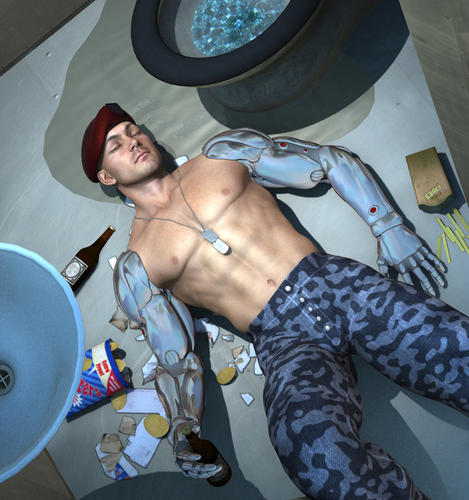 This is not one of Sarge's better moments.In fact, I'm absolutely certain Sarge would never do this. But, since I wanted to show the bathroom in this new set, and well, I've never used the inebriated poses, I decided to volunteer Sarge for the task. I do think the Frenchfries look a bit pencilly. And this is after me shortening and widening them.