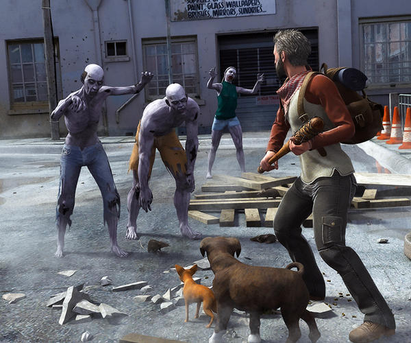 I think this is one of your best lit scenes- it's so crisp with excellent contrasts. And I happen to like the dogs! (Dogs will be dogs, ya know?) The zombies are just downright creepy- well done!