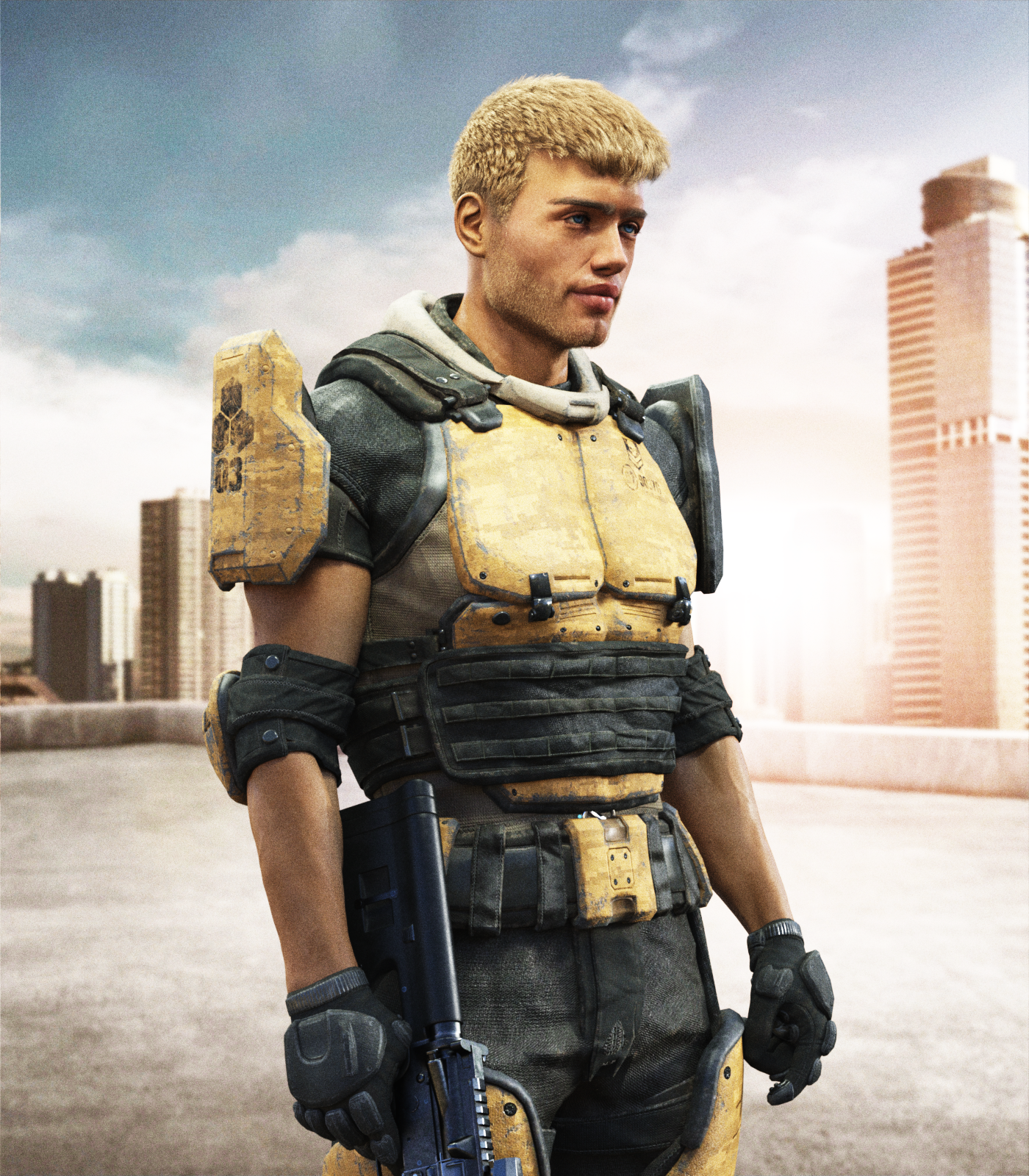 This is the tan version. I've decided there are 2 things I don't like about the set. One is the neck piece. I may be able to leave it off but it lacks detail and is lumpy. In the tan verison there is no matching amber color, so it stands out.  I also haven't done a render of the helmet I like. It seems rather small and close-fitting. The night vision goggles don't look convincing to me... Maybe... Too bright. I will have to see if I can retexture them.