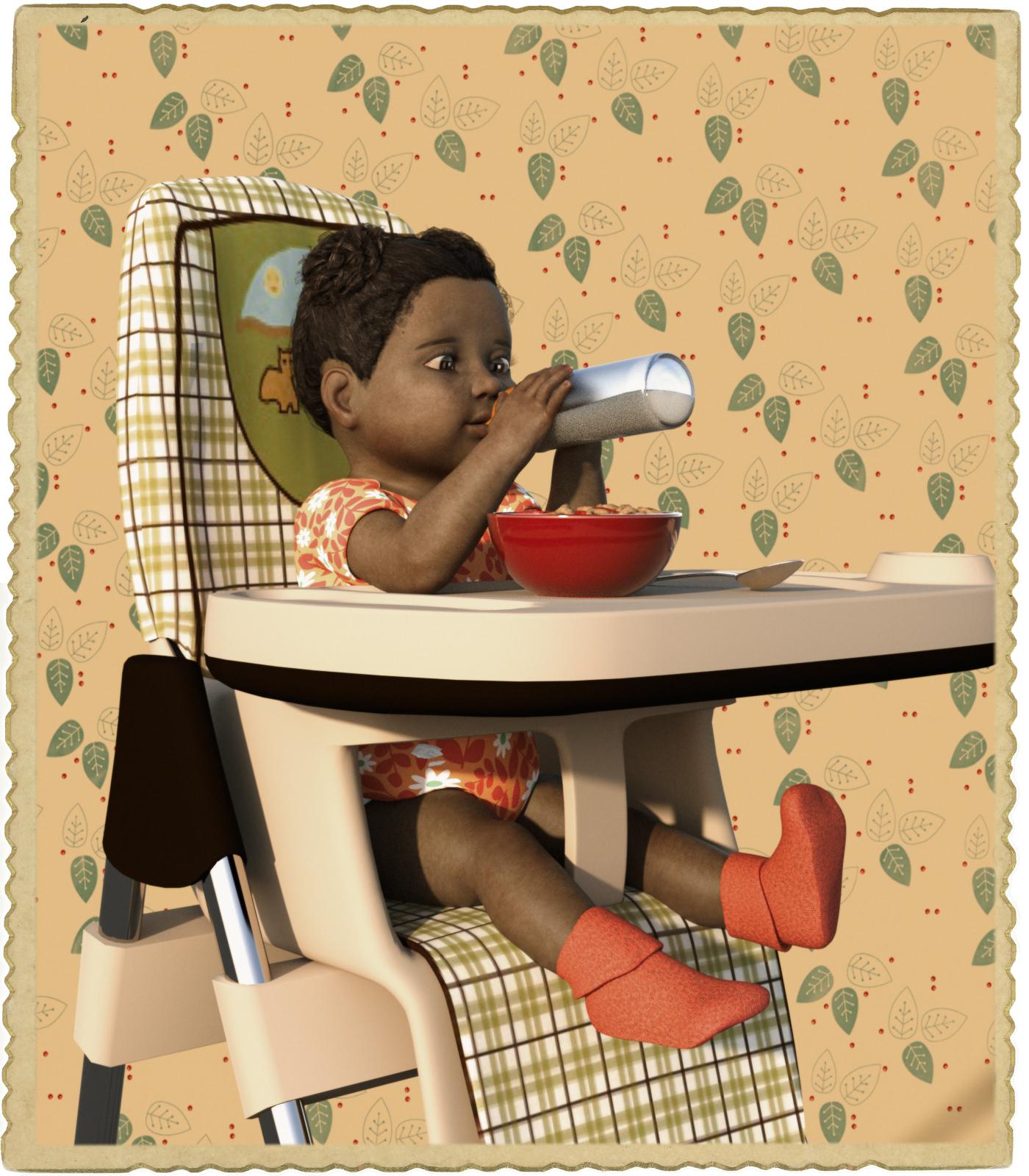 There are two sets, the props, which are blackened and well.. Westpark and the texture expansion here: https://www.daz3d.com/west-park-nursery-props-clinical  The baby bottle has a hidden milk option which you can enable in its properties to make the milk look right. (Thanks Phoenix1966 for that find).   You can of course use whatever bottle you please. The pose may or may not work with it though. I recolored the nipple of the bottle quite easily that orange rubber color from black.