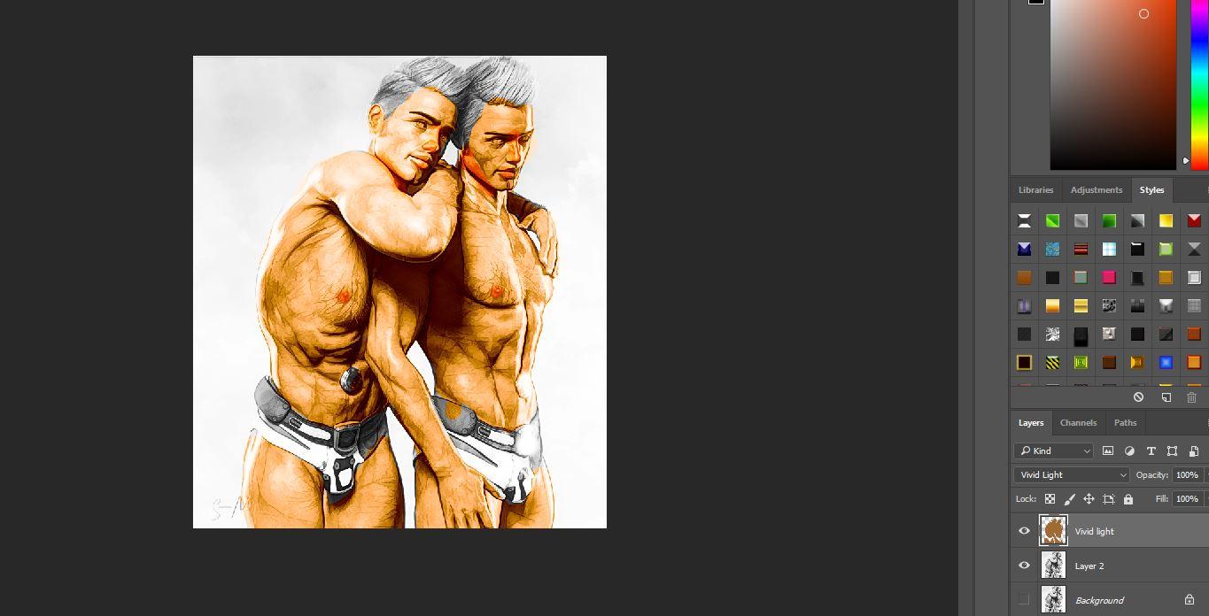 With that image as the background, (I would save a layer just in case you mess up), you can begin to paint the skin in vivid light mode. The vivid light mode, with ease the black out of the image, creating a more painterly appearence. I am not going for real, just sort of painterly comicy effect.