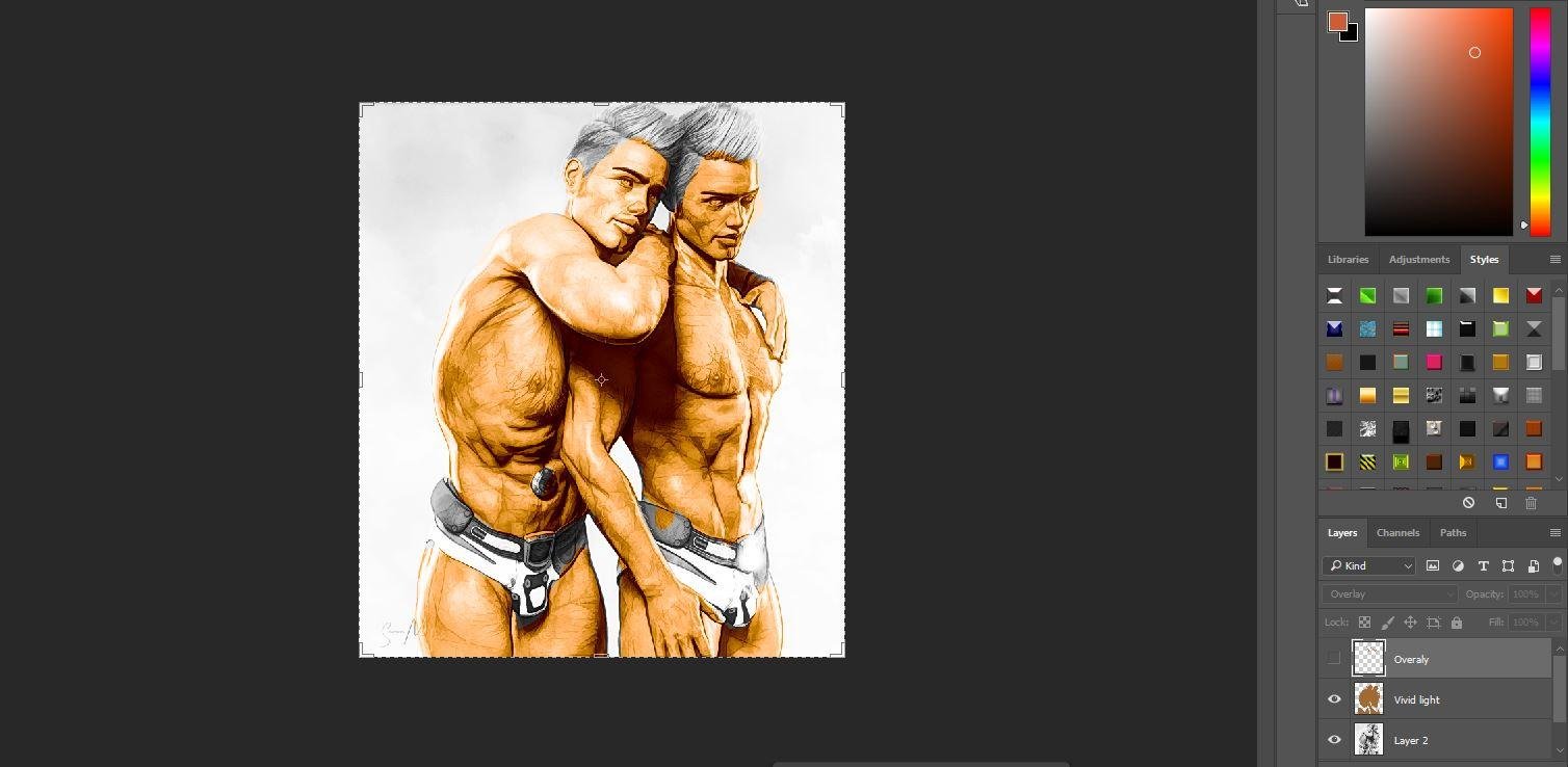 A new layer should be added to add skin highlights in areas where light will go through the skin. Using overay mode, choose a rusty bricky red color and highlight these areas. The bricky red overlay color will ease more black out of the line art and create color and and interest in the flat parts of the skin. You can go back and erase areas where the color has splashed onto the outfit and unwanted body areas.