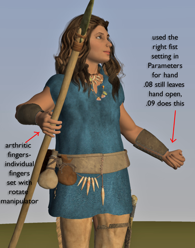 First, not using the Hand Parameters, for her right hand holding the spear, I moved the fingers and joints separately with the rotate manipulator. She looks like she has arthritis! the joints go so far our of wack with the smallest of adjustments which are hard to do with the third joint of the pinky no matter how far I zoom in with the camera!