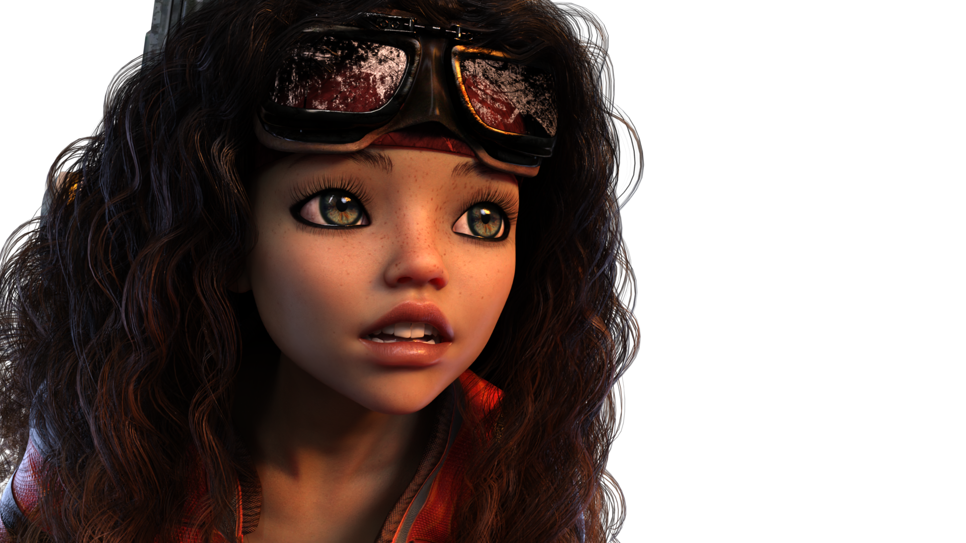 This frame of performance is enhanced with a dial on the Pose Controls addon facial rig that I use to correct the placement of the centers of the lips when they go too high. One of my new facial dials is working the corners of her mouth down and back simulataneously utilizing several morphs at once, making it really easy to dial in a few more facial enhancements.