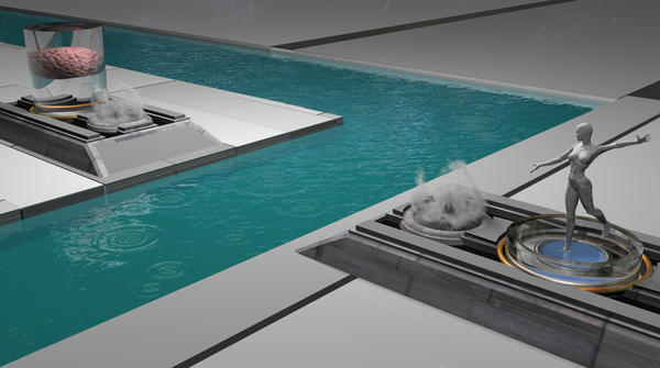 Getting late with the last two, I wanted this to be minimal almost abstract, There is no nudity the girl is wearing the Bot Armor for Gen 2, but I could not get the new shaders into Bryce so I used Bryce materials on her, I was listening to Hemispheres by Rush when I came up with the idea so yea it's a little on the strange side, it's called Data Stream Interrupted.