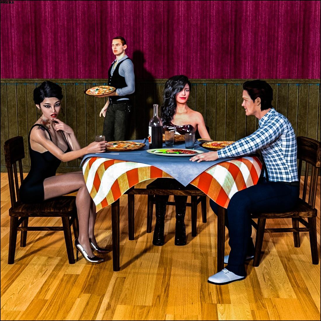 This reminds us of a snapshot taken with friends in the good old days. You have created a good mix of human interactions between your figures and that brings interest to the viewer. You used multiple lights to add the sense that you are in a pizzeria and this adds more interest. It was a nice touch to place the waiter in the back to break the symmetry that was created with the position of the camera and the seated figures. Well done Pericolo.